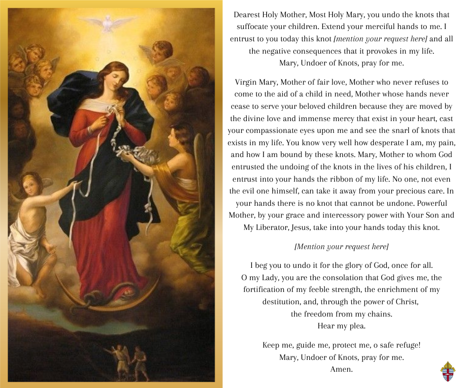 In honor and care for each marriage in our Diocese, we are highlighting this novena to Our Lady Undoer of Knots, a devotion which started from the earnest prayers of a spouse on the verge of divorce.