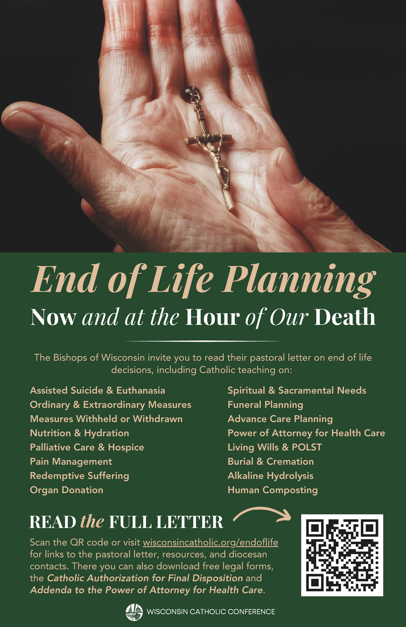 Talking about and facing end of life planning can be difficult. Now and at the Hour of Our Death, a pastoral letter from the Catholic Bishops of Wisconsin, helps foster conversations and answer questions related to end of life decision-making utilizing the Church’s teaching. It includes guidance for those facing health issues, as well as for those who care for them. The letter covers a wide variety of issues, including: